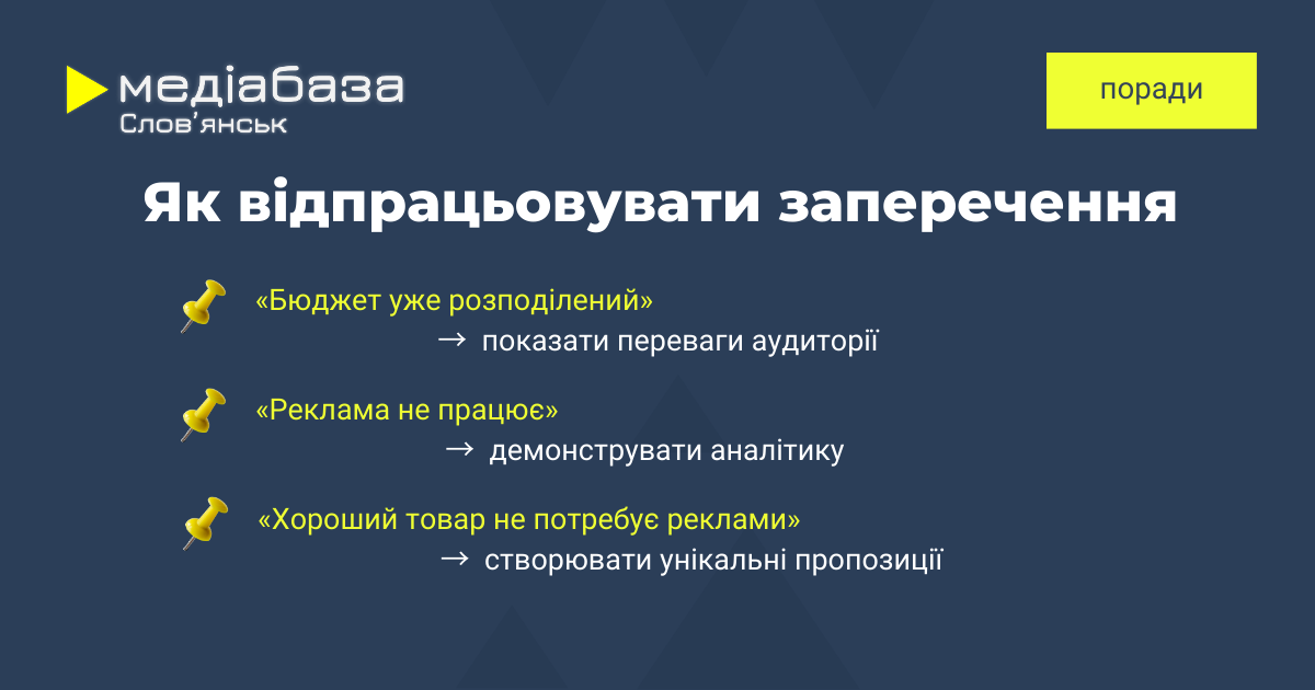 Рекламодавці часто кажуть: “бюджет уже розподілено”, “ми рекламуємося самостійно”, “реклама не працює”, “хороший товар не потребує реклами”. Учасники тренінгу поділилися власним досвідом, а Таїсія Гармаш допомагала знаходити ефективні відповіді.