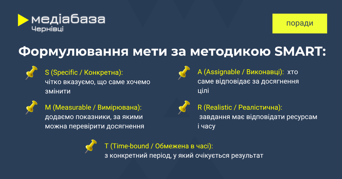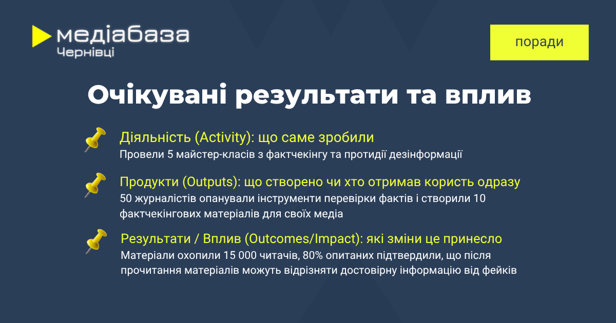 Спілкуючись мовою донорів, потрібно бути максимально конкретним. Тренерка звернула увагу, що туманні формулювання (“покращити ситуацію”) створюють враження нечіткості, вони є надто загальними й невимірюваними. Натомість медіа мають використовувати чіткі формулювання, що вказують на конкретні результати: “збільшити охоплення на 20%”, “створити 15 аналітичних матеріалів” тощо.