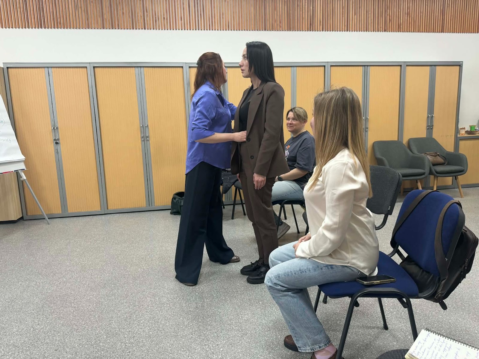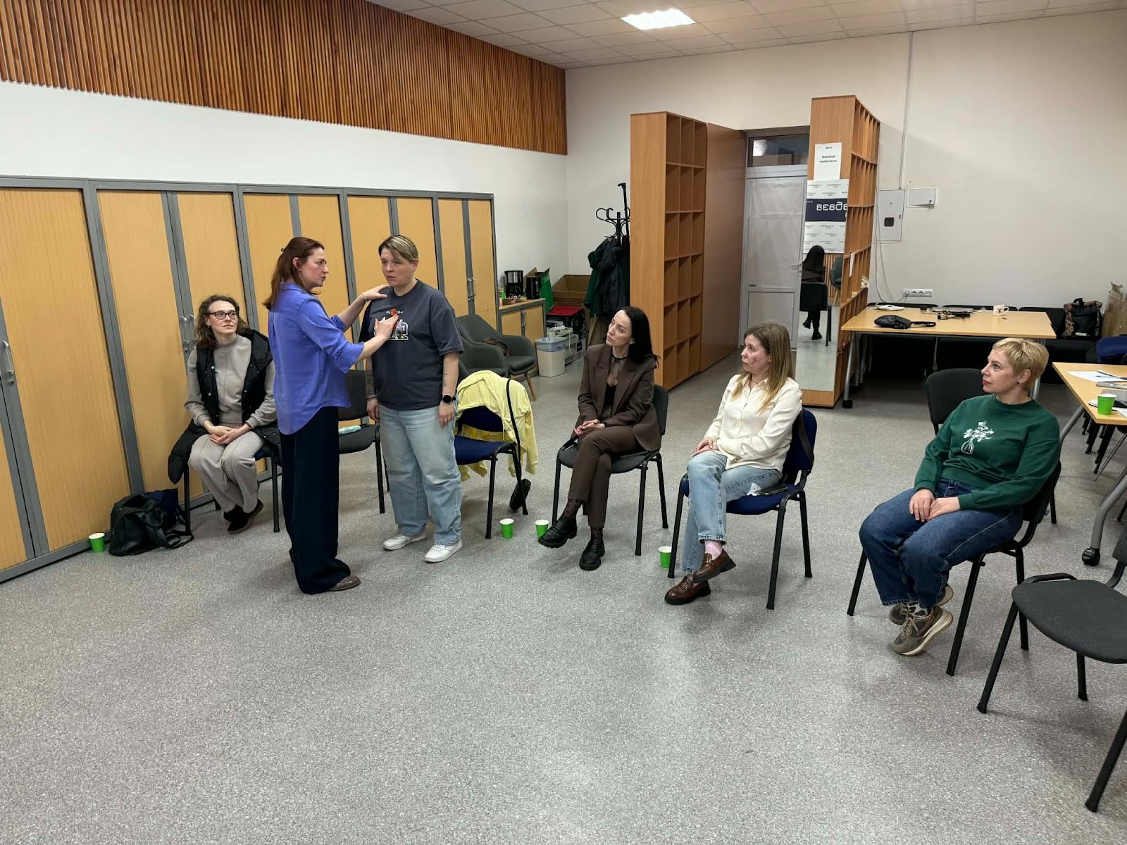 Під час тренінгу учасники виконували практичні вправи для покращення дихання та роботи голосового апарату. Зокрема, опановували техніки очищення носових каналів: на видиху — масаж крилець носа, на вдиху — легке постукування по них, а потім навпаки.