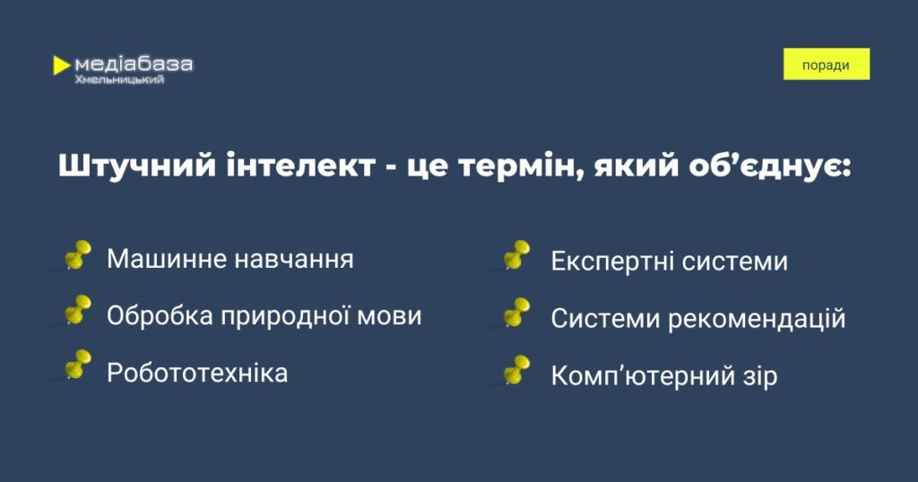 Штучний інтелект – це парасольковий термін, який охоплює спектр різних технологій: машинне навчання, роботехніка, оброблення природної мови, експертні системи, системи рекомендацій, комп’ютерний зір.