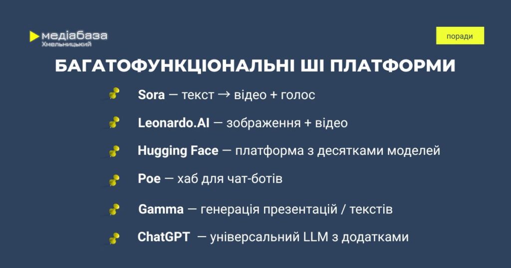 Багатофункціональні ШІ-сервіси, які працюють на межі кількох категорій. Колаж – Медіабаза Хмельницький