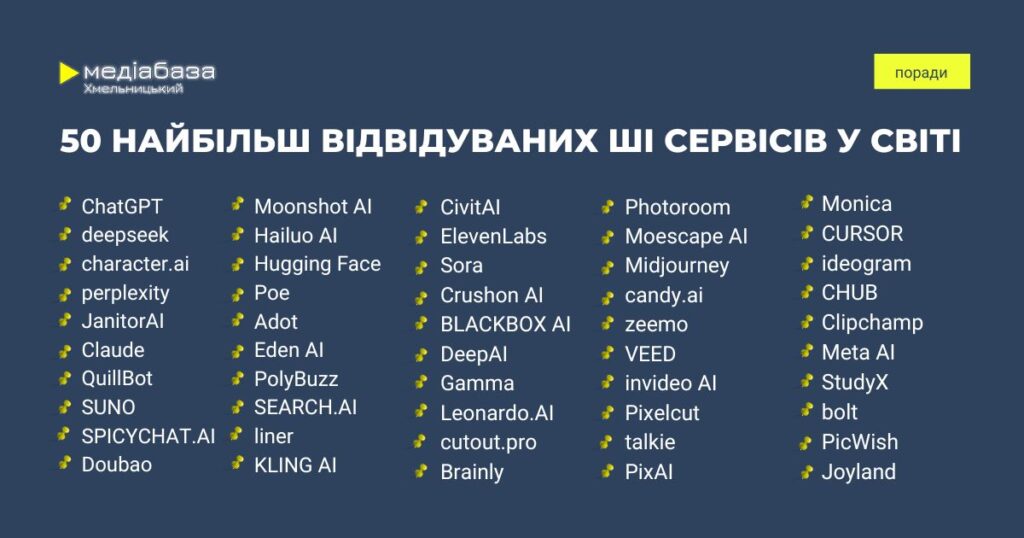 50 найвідвідуваніших ШІ-сервісів у світі. Колаж – Медіабаза Хмельницький
