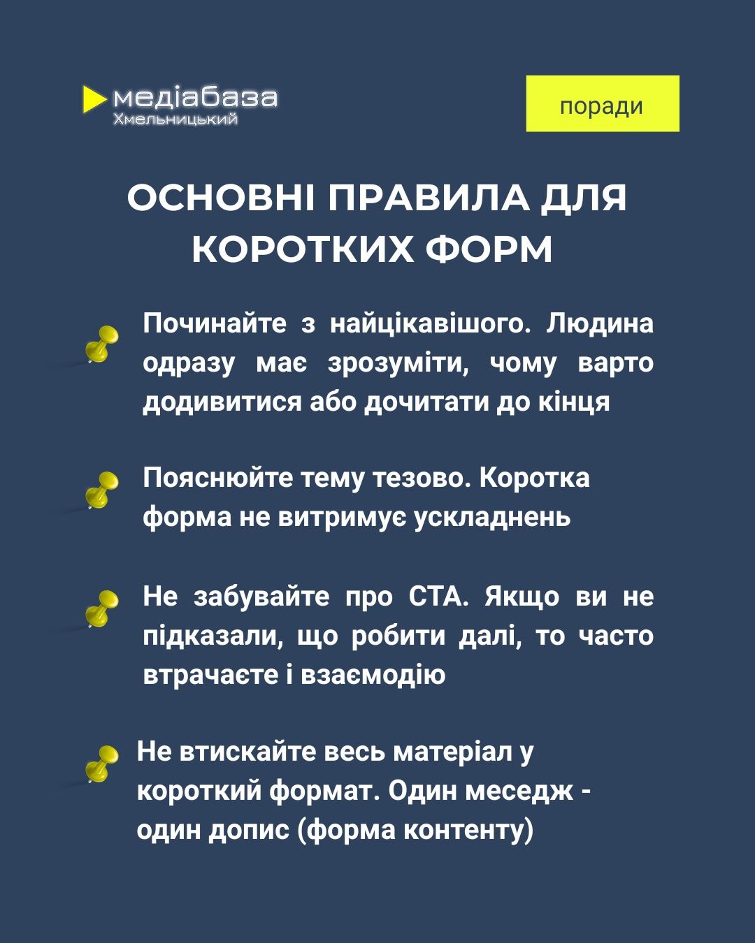 - Пояснюйте тему тезово. Коротка форма не витримує складних відступів, перевантажених конструкцій і надлишкових подробиць.
