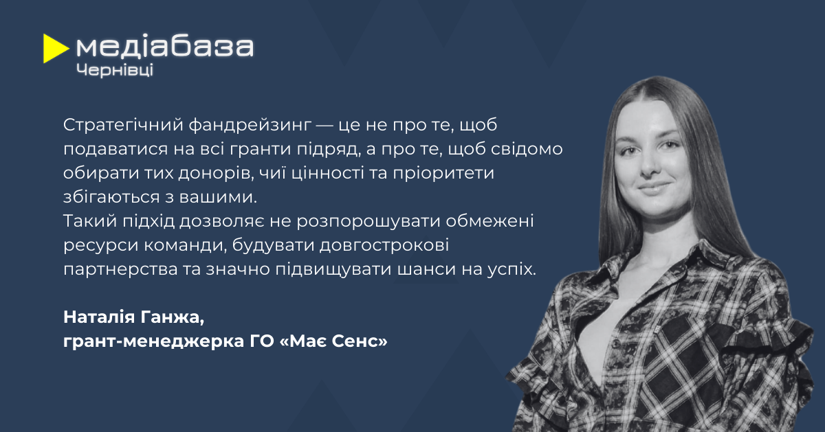 Для багатьох редакцій робота з грантами нагадує гасіння пожеж: постійний пошук оголошень та спроби “вскочити в останній вагон” перед дедлайном. Проте стратегічний підхід дозволяє фокусуватися лише на тих донорах, чиї цінності збігаються з місією медіа. Так ви не будете розпорошуватися на “випадкові”»” заявки і зможете працювати більш усвідомлено.