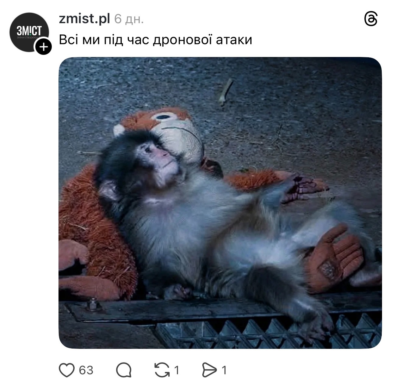 “Наприклад, ми сьогодні розповідали про дронову атаку в Полтаві. Але ми не можемо туди публікувати просто матеріал про те, що були вибухи й щось пошкоджено. Бо насправді там це нікому не потрібно. Тому наш SMM-менеджер зробив картинку із сумною мавпочкою й написав, що в нас була дронова атака і ми, в принципі, сьогодні всі себе почуваємо, як ця мавпочка. У такий спосіб ми і донесли інформацію, що була дронова атака, і показали емоцію, – поділилась Анастасія. – І цей мем ми опублікували тільки в Threads, тому що в інших соціальних мережах ми собі не можемо дозволити подібного”.