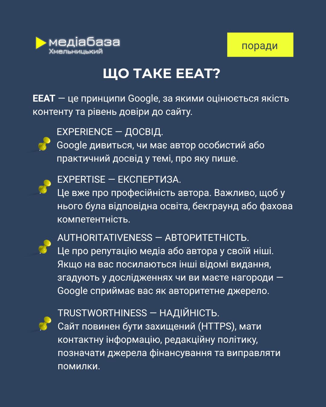 Google дивиться, чи має автор особистий або практичний досвід у темі, про яку пише. Наприклад, якщо журналіст був на місці подій або сам працює у сфері, про яку розповідає, це підвищує довіру до матеріалу.
