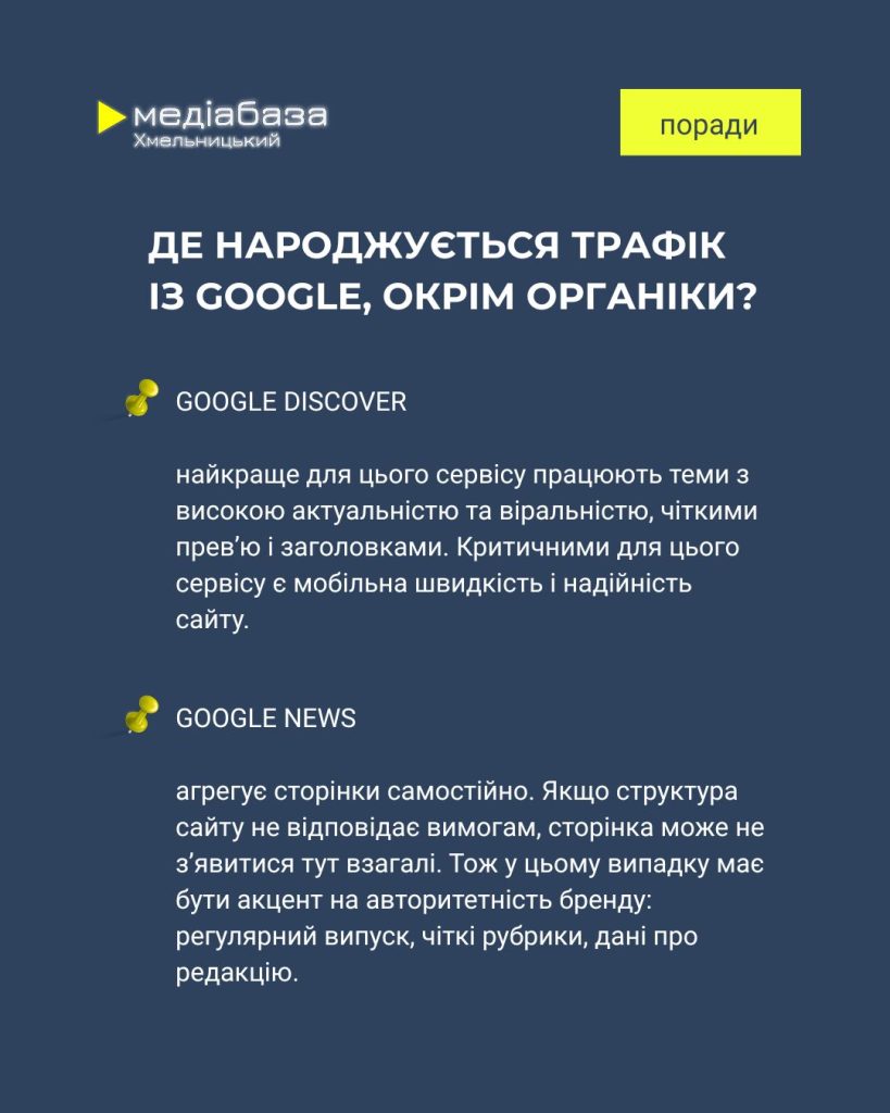 Можливість отримати безкоштовні переходи зацікавленої аудиторії надає Google Discover. Як і у випадку з основною пошуковою видачею, потрапляння контенту до цього сервісу залежить від алгоритмів Google, на роботу яких практично неможливо вплинути безпосередньо. За словами експертки, найкраще для цього сервісу працюють теми з високою актуальністю та віральністю, чіткими прев’ю і заголовками. Критичними для цього сервісу є мобільна швидкість і надійність сайту.