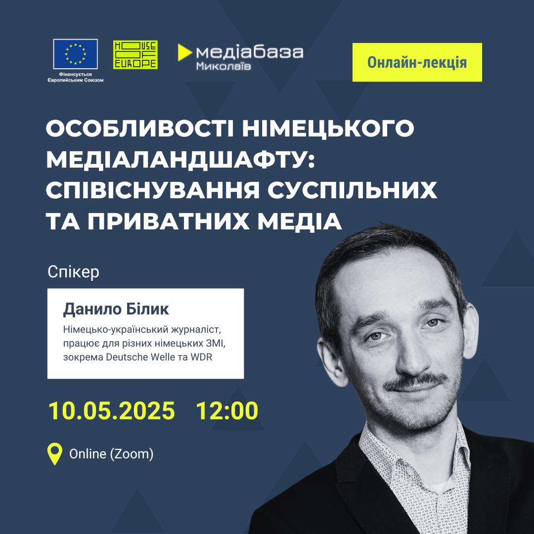 10 травня, о 12:00, у співорганізторстві з журналістським регіональним хабом Інституту масової інформації “Медіабаза Миколаїв” пройде онлайн-лекція “Особливості німецького медіаландшафту: співіснування суспільних та приватних ЗМІ”.