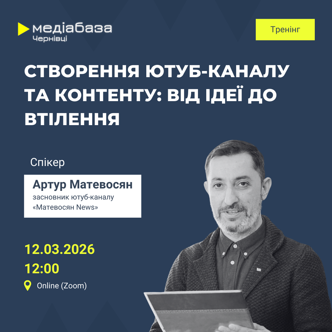 12 березня, о 12:00, регіональний хаб Інституту масової інформації “Медіабаза Чернівці” організовує вебінар “Створення ютуб-каналу та контенту: від ідеї до втілення”. До участі запрошують журналістів, редакторів та представників/ць медійних організацій.