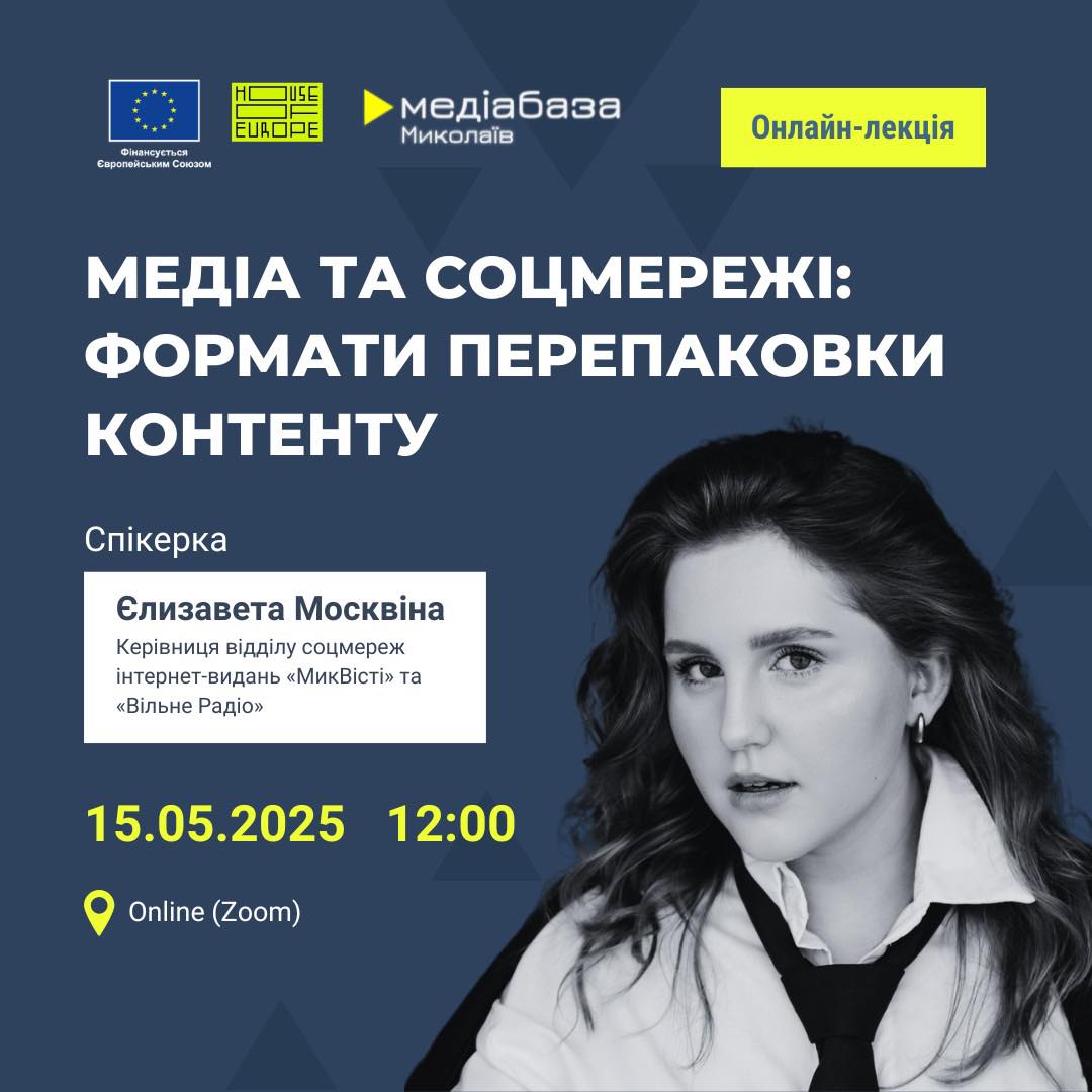 15 травня, о 12:00, у співорганізторстві з журналістським регіональним хабом Інституту масової інформації “Медіабаза Миколаїв” пройде онлайн-лекція “Медіа та соцмережі: формати перепаковки контенту”.