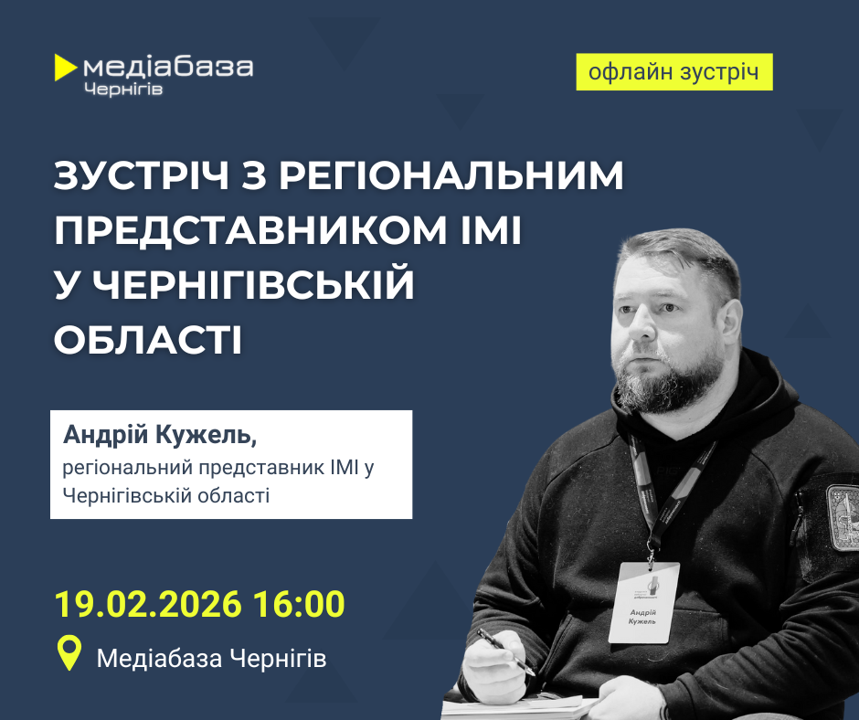 19 лютого, о 16:00, регіональний хаб Інституту масової інформації “Медіабаза Чернігів” запрошує представників медіа на зустріч-знайомство з новим регіональним представником Інституту масової інформації в Чернігівській області Андрієм Кужелем.