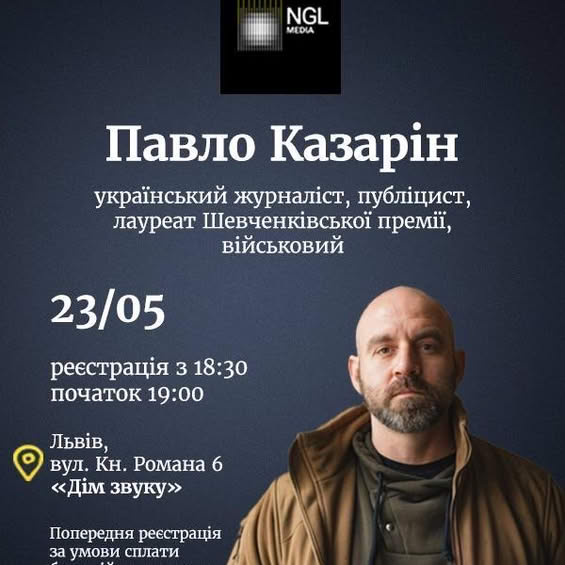 23 травня у Львові (Дім Звуку – вул. Князя Романа, 6) відбудеться відкрита розмова з українським журналістом, публіцистом, лауреатом Шевченківської премії та військовим Павлом Казаріним. Про це повідомляється на Facebook-сторінці NGL.media.