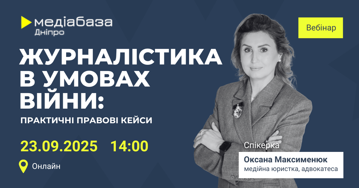 Регіональний хаб Інституту масової інформації “Медіабаза Дніпро” 23 вересня, о 14:00, проведе вебінар “Журналістика в умовах війни: практичні правові кейси”. Захід буде корисним для журналістів, редакторів, фотокореспондентів, операторів, а також студентів факультетів журналістики та всіх, хто працює у сфері медіа під час війни.
