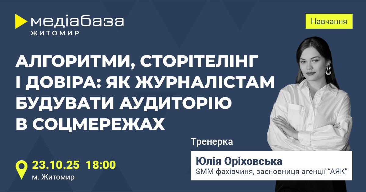 Регіональний хаб Інституту масової інформації “Медіабаза Житомир” запрошує 23 жовтня, о 18:00, на тренінг “Алгоритми, сторітелінг і довіра: як журналістам будувати аудиторію в соцмережах”.