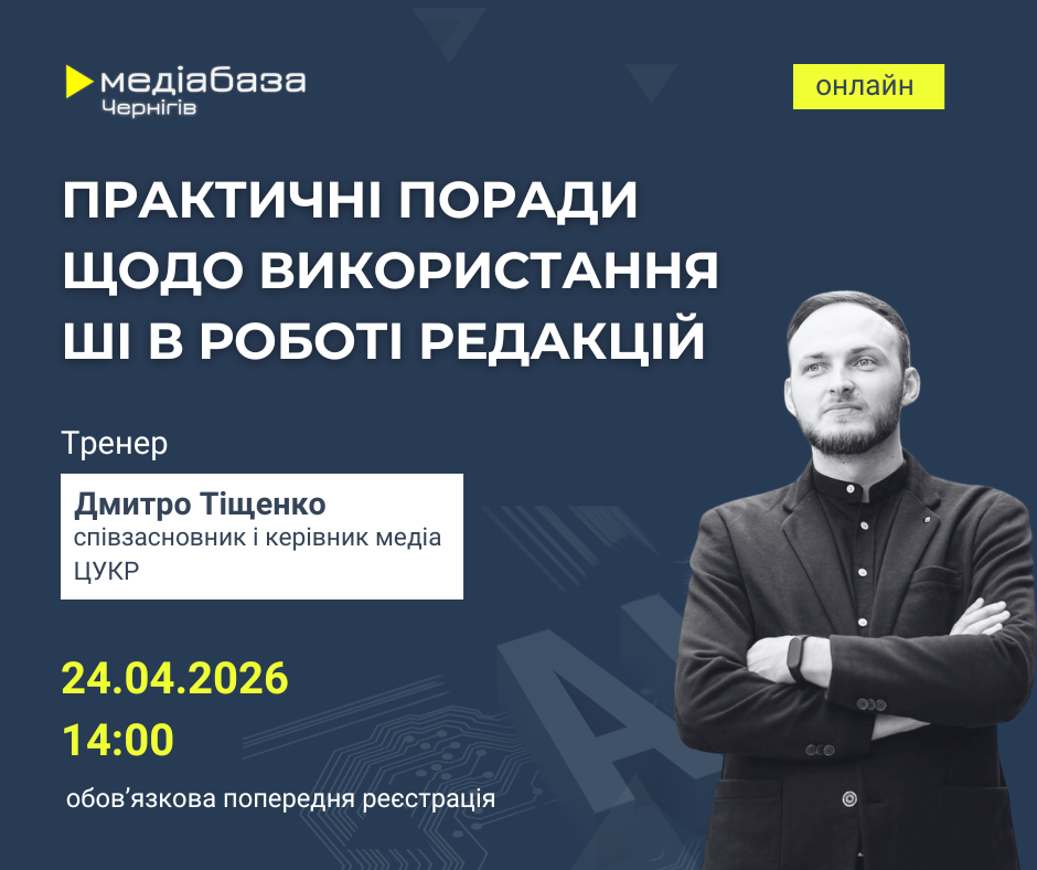 24 квітня, о 14:00, регіональний хаб Інституту масової інформації “Медіабаза Чернігів” проведе онлайн-тренінг “Практичні поради щодо використання ШІ в роботі редакцій”.