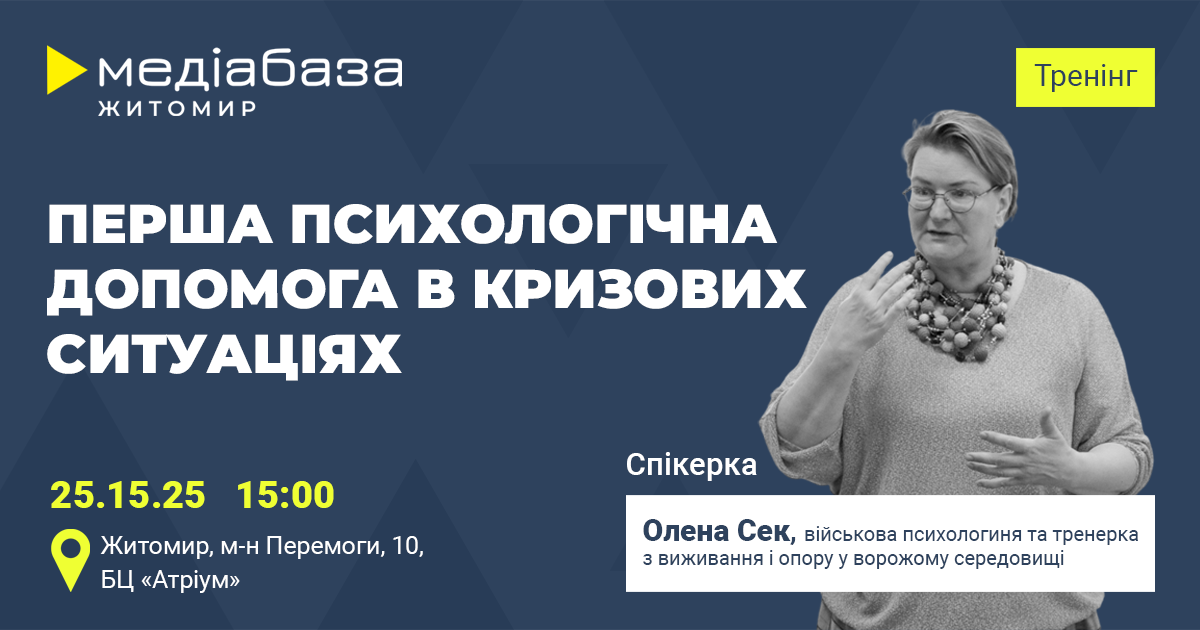25 листопада 2025 року, о 15:00, регіональний хаб Інституту масової інформації “Медіабаза Житомир” проведе тренінг “Перша психологічна допомога в кризових ситуаціях”.