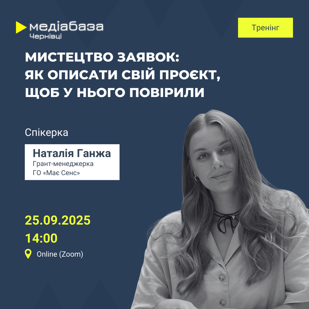 Регіональний хаб Інституту масової інформації “Медіабаза Чернівці” 25 вересня, о 14:00, проведе онлайн-тренінг “Мистецтво заявок: як описати свій проєкт, щоб у нього повірили”.