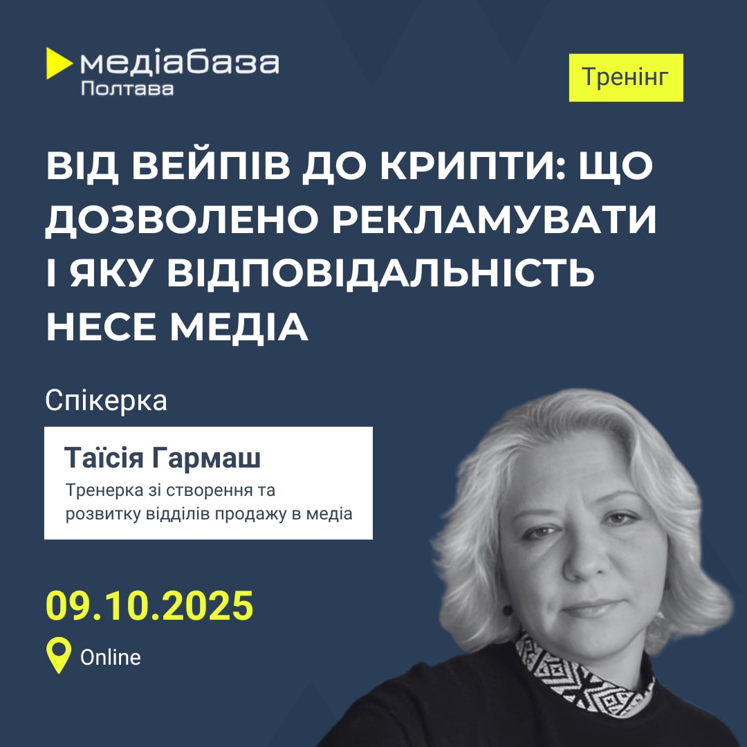 9 жовтня, о 14:00, журналістський регіональний хаб Інституту масової інформації “Медіабаза Полтава” проведе онлайн-тренінг “Від вейпів до крипти: що дозволено рекламувати і яку відповідальність несе медіа”.