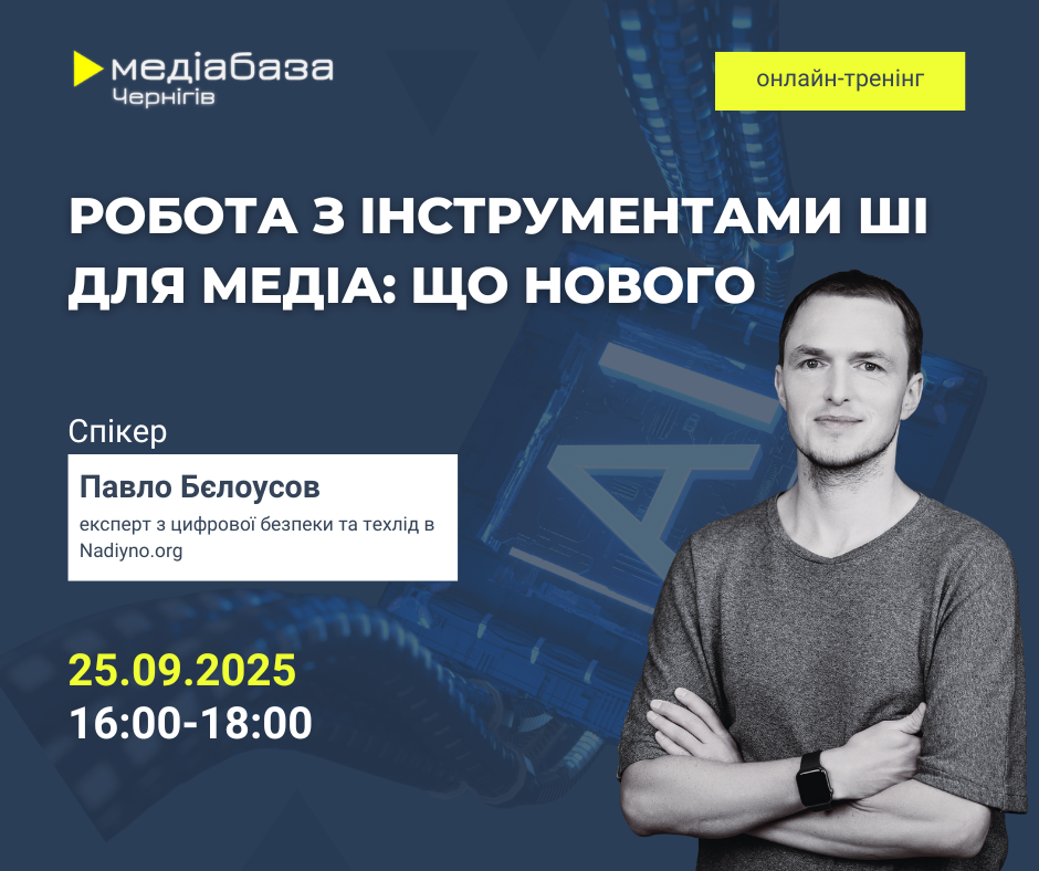 25 вересня, із 16:00 до 18:00, регіональний хаб Інституту масової інформації “Медіабаза Чернігів” проведе онлайн-тренінг для журналістів “Робота з інструментами ШІ для медіа: що нового”.