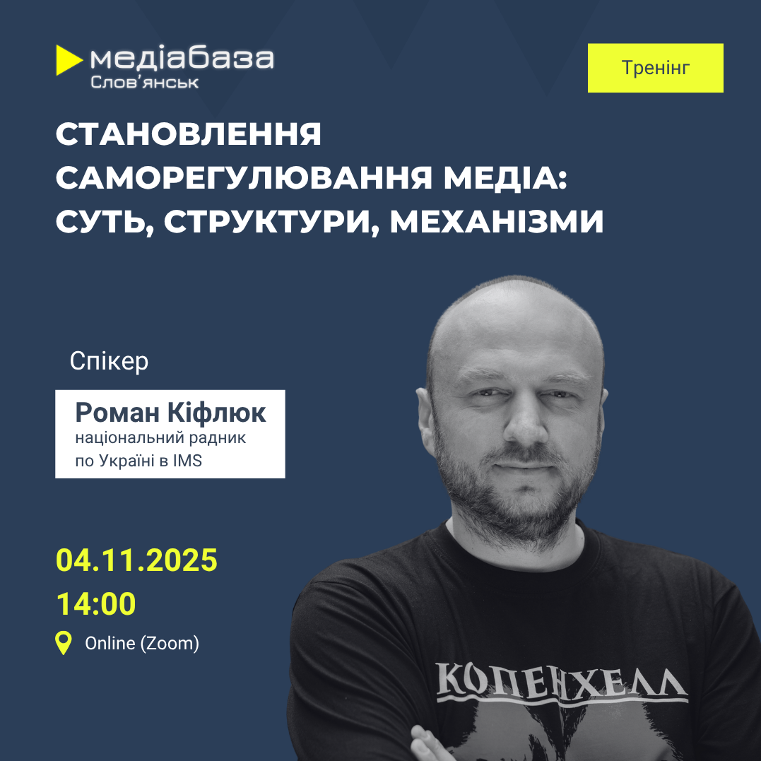 Регіональний хаб Інституту масової інформації “Медіабаза Слов’янськ” запрошує журналістів, редакторів і медіаменеджерів на онлайн-тренінг “Становлення саморегулювання медіа: суть, структури, механізми”, який відбудеться 4 листопада 2025 року о 14:00 у Zoom.