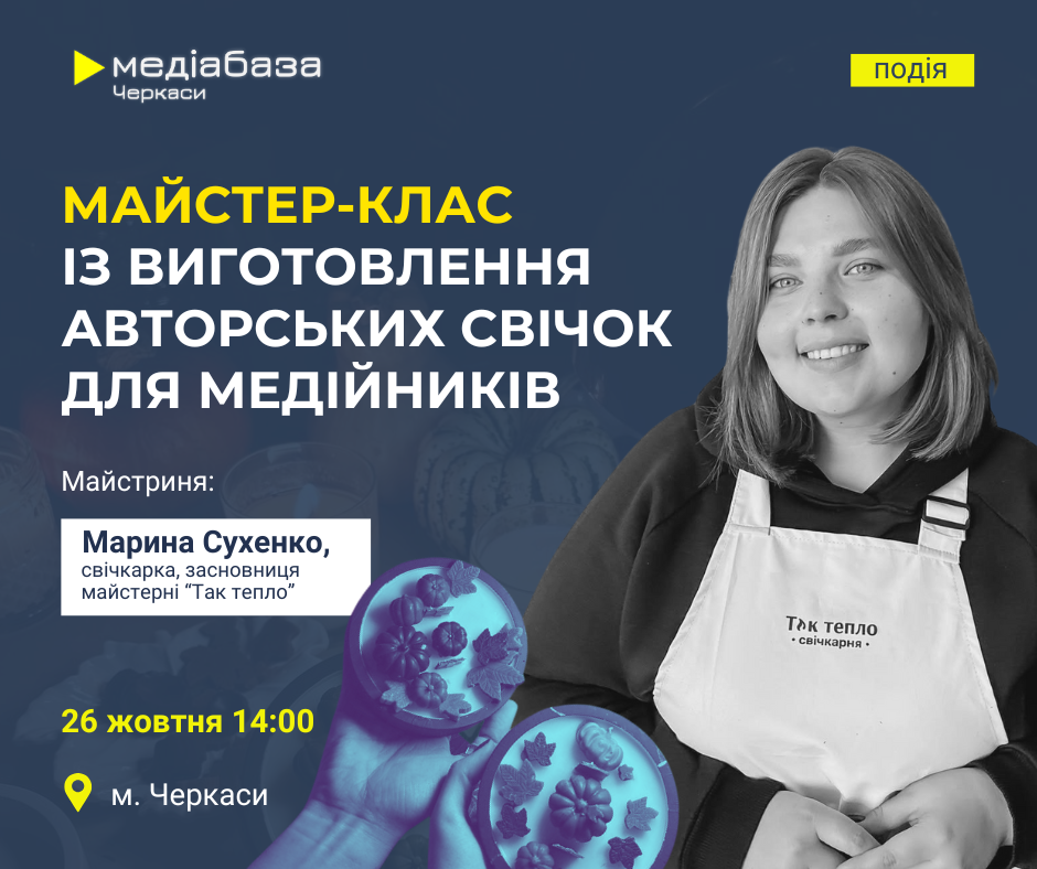 26 жовтня регіональний хаб Інституту масової інформації “Медіабаза Черкаси” організовує майстер-клас зі створення свічок для медійників. Його проведе свічкарка та засновниця майстерні “Так тепло” Марина Сухенко.