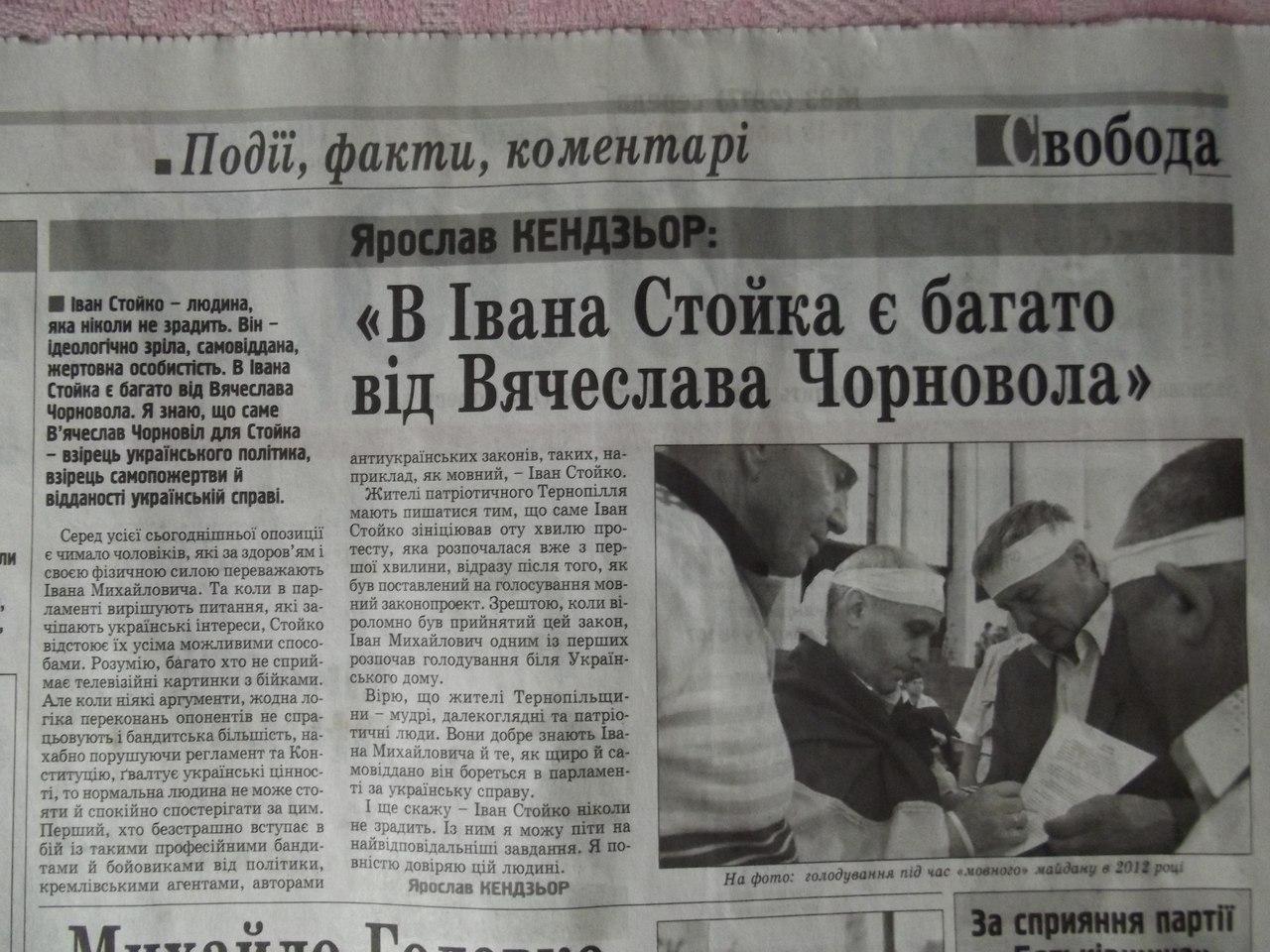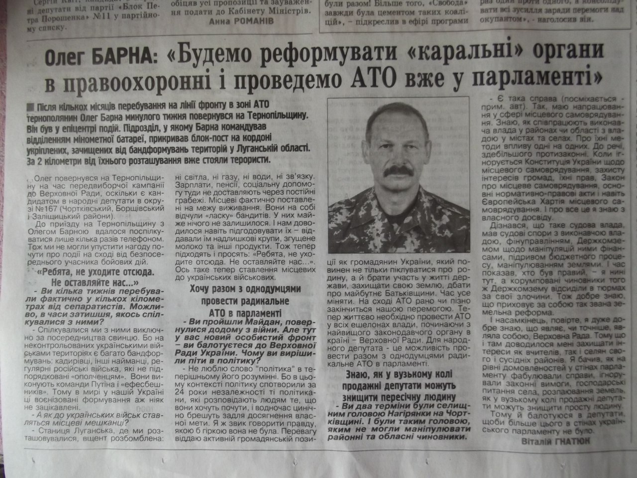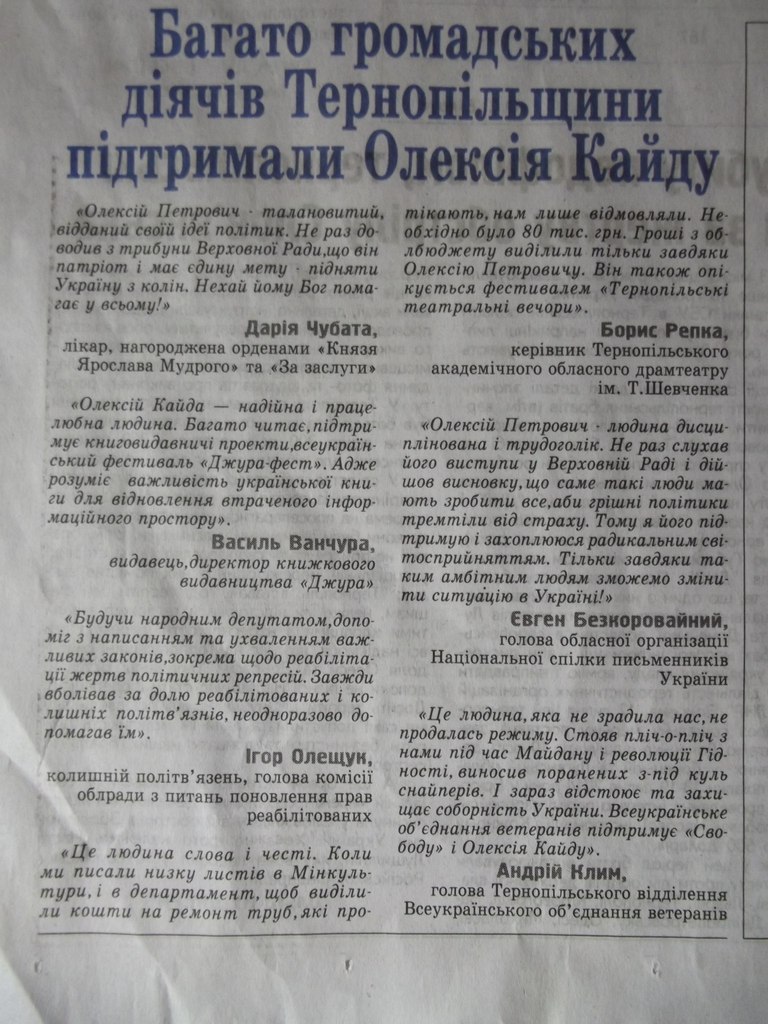 Отож, Івану Стойку (фото № 1) «Свобода» подарувала оду щодо його унікальної самобутності та важливої громадської діяльності, себто пропіарили на славу. Як і попередньому, Олексію Кайді (фото № 2) вихваляння та захоплення висловила спільнота діячів Тернопільщини – тут використали психологічний прийом – зіграли на авторитетності. Тарас Пастух (фото № 3), навпаки, воліє облити брудом владу теперішню й колишню ( 2 останні абзаци « Про владу, негідників і романтиків», « Про оновлення у владі»). Солідарно із УНПівцем, Олег Барна (фото № 5), теж піддає нищівній критиці як ВРУ, так і діючу судову й виконавчу владу. Його партійний побратим Тарас Юрик (фото № 4) ж, навпаки, висловлює подяку Президентові за його діяльність, а саме пакет реформ, не оминаючи також і свою благодійницьку діяльність у АТО.