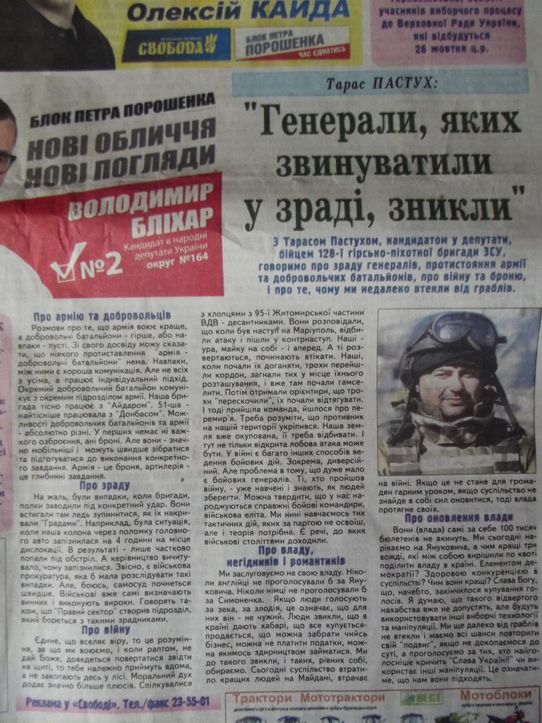 Хоч ми усі вже звикли до всебічної агітації — чуємо її, бачимо, читаємо — вражає те, що мас-медіа уже не соромляться навіть приховувати «джинсу». Зокрема, газета "Свобода" (№83 11-15 жовтня 2014 року) — це видання Тернопільської обласної ради та обласної держадміністрації, публікує замовлений матеріал відразу від декількох політичних партій – кандидатів на вибори у парламент: свободівець Олексій Кайда, кандидат від «Української народної партії» Тарас Пастух, аж двоє висунуті «Блоком Петра Порошенка» Олег Барна та Тарас Юрик, а також самовисуванець Іван Стойко. Цілковитий плюралізм політичних позицій, чи не так?