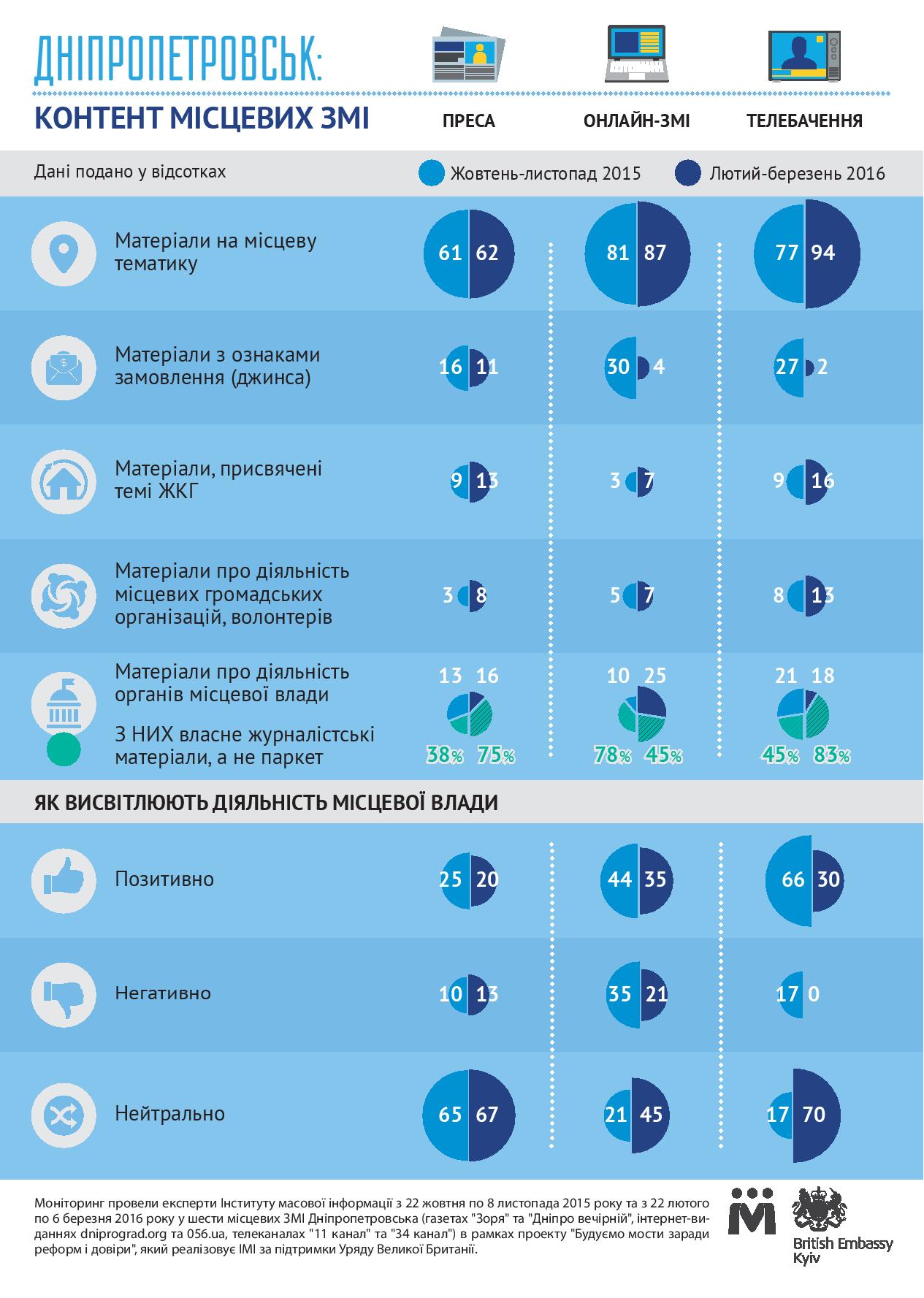 У Дніпропетровську рівень суспільно важливих місцевих матеріалів у порівнянні з першою хвилею моніторингу зріс на 8% і склав 81% від загальної кількості матеріалів. Найвищий показник зафіксовано на телебаченні — 94% і в порівнянні з попереднім показником він зріс найбільше на 17%, у інтернет-ЗМІ показник зріс на 6% і склав 87%. Найгірші показники зафіксовані у друкованих виданнях — лише 62%.