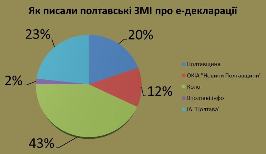 Найбільше на тему електронного декларування писали видання «Коло», «Полтавщина», ІА «Полтава». Якщо перше ЗМІ подавало короткі інформативні публікації, які стосувалися конкретної особи, то друге подавало розлогі матеріали з претензією на аналітичну публікацію. Так само невеликі інформативні публікації подавало інформаційне агентство «Полтава». Ще одне видання, «ВПолтаві.інфо», за перший тиждень листопада, тобто після того, як завершився термін подання електронних декларацій, не подало про це жодної публікації. Як пояснила у коментарі головна редакторка «ВПолтаві.інфо» Наталія Очкань, редакція збирається готувати ґрунтовні матеріали згодом.