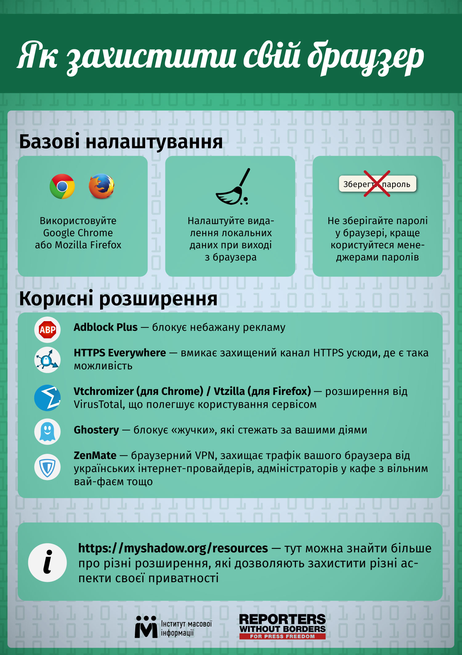 Основні налаштування браузера для безпечної роботи та корисні додатки — на інфографіці від ІМІ.