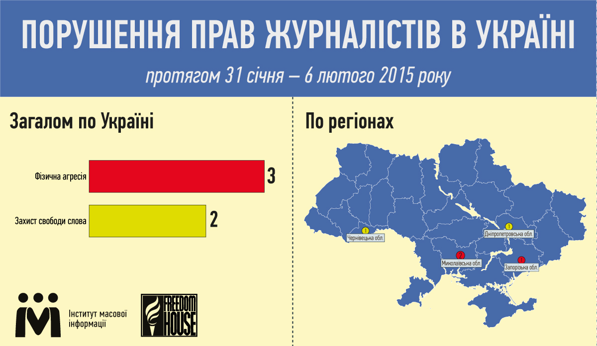 У період з 31 січня по 6 лютого 2015 року в Україні зафіксовано три випадки фізичної агресії проти журналістів та два випадки, пов’язані із захистом свободи слова.