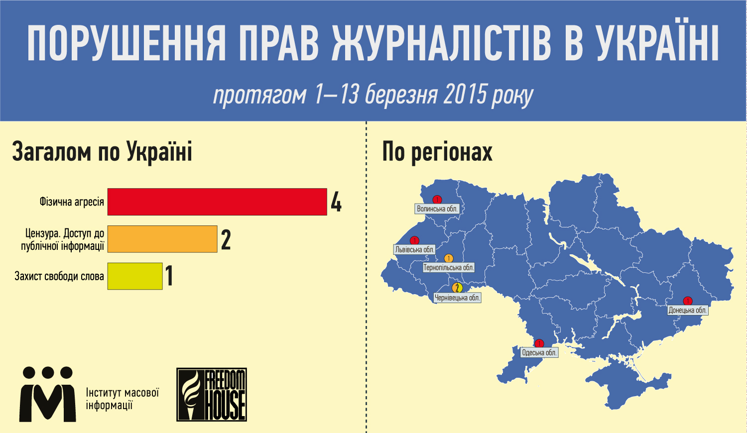 У період з 1 по 13 березня 2015 року в Україні зафіксовано 4 випадки фізичної агресії проти журналістів, два випадки в категорії «Цензура. Доступ до інформації» один в категорії «Захист свободи слова».