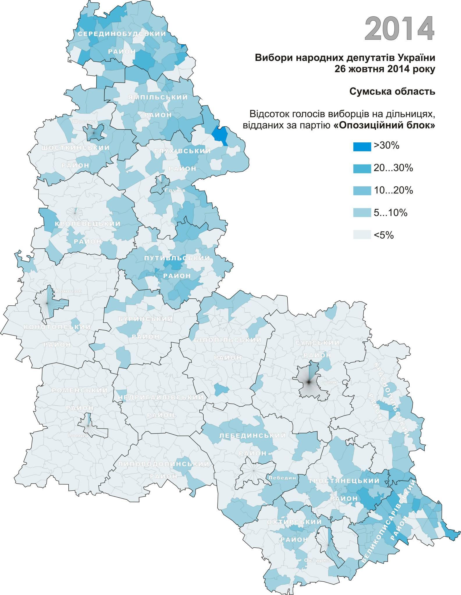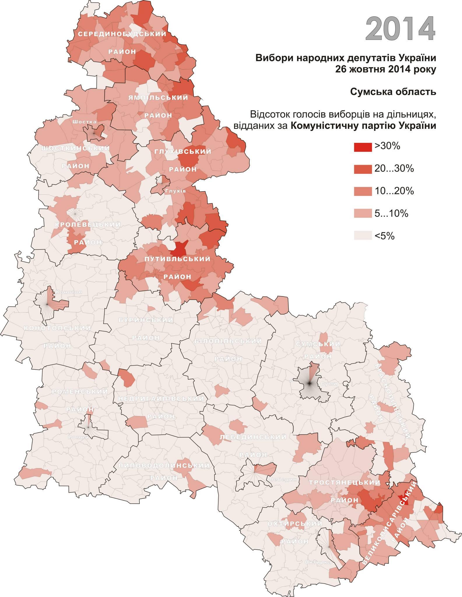 Інформаційна пропаганда не може залишатися без наслідків, змінюючи настрої місцевого населення. Це чудово показують результати голосування на виборах. Наприклад, карти результатів голосування на останніх парламентських виборах за проросійськи орієнтовані партії – Комуністичну та Опозиційний блок – майже точно співпадають з картою покриття російськими каналами. Найбільше голосів за ці партії віддали саме Середино-Будський, Ямпільський, Глухівський, Путивльський і Великописарівський райони.