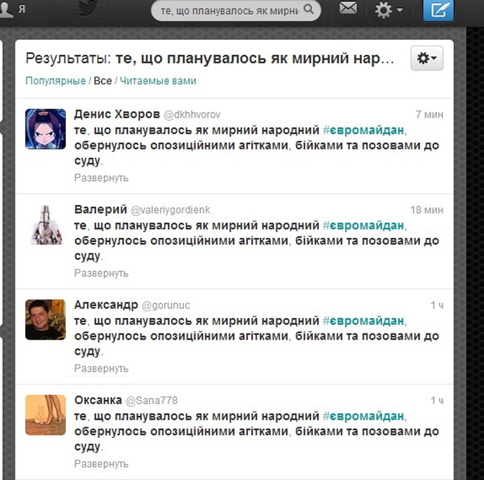 Наприклад дослівно копіювався та масово тиражувався наступний твіт: "Був учора ввечері на #євромайдан холодно, захворів, завтра вже нікуди не піду. Фарс від опозиції".