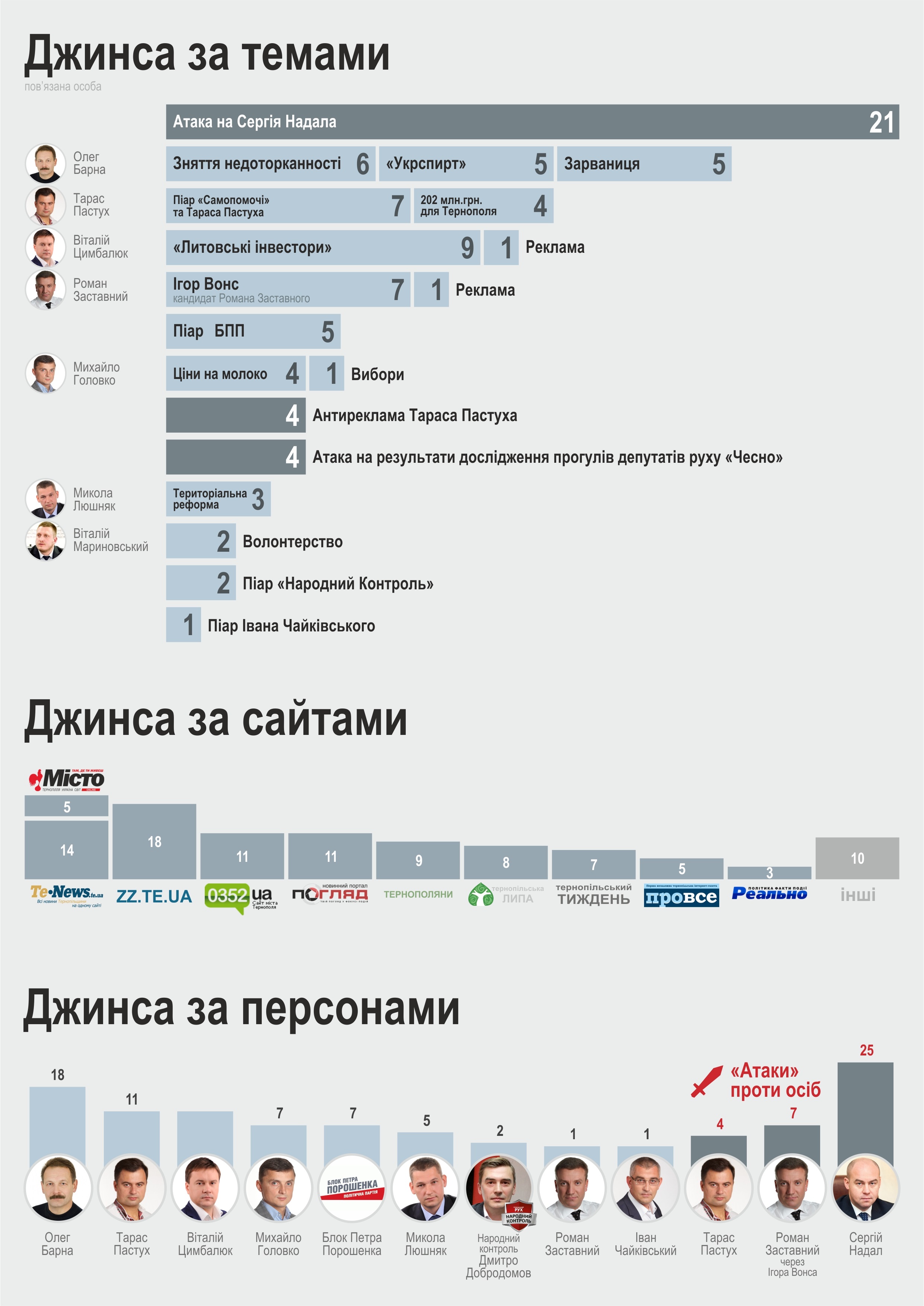 Надмасштабну "джинсову" атаку у тернопільських ЗМІ здійснив екс-депутат міської ради від Партії регіонів – Віталій Цимбалюк. Одразу 20 (!!!) великих рекламних матеріалів були запущені в два етапи (на 10 !!! сайтах), а також рекламний ролик транслювався на гучномовцях "Вуличного радіо" (власник – Андрій Грицишин – Самопоміч).