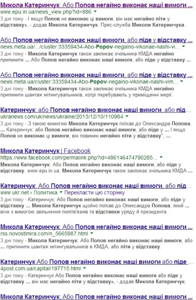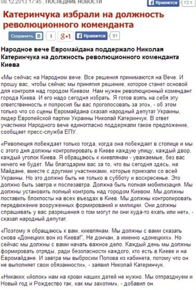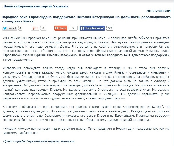 Натомість, Янукович відсторонив Попова від посади голови КГГА. «Рев-Ком» Катеринчук якби був справжнім Рев-Комом, а не рядженим, мав би брати владу в свої руки, натомість його діяльності вистачає лише на розставлення при виходах із метро палаток, пафосно названих «мобілізаційними пунктами» – та й ті доводиться час від часу переносити «через активну протидію міліції».