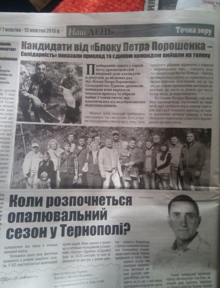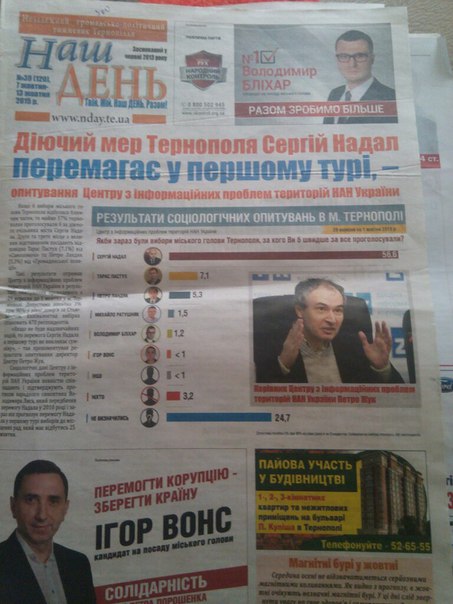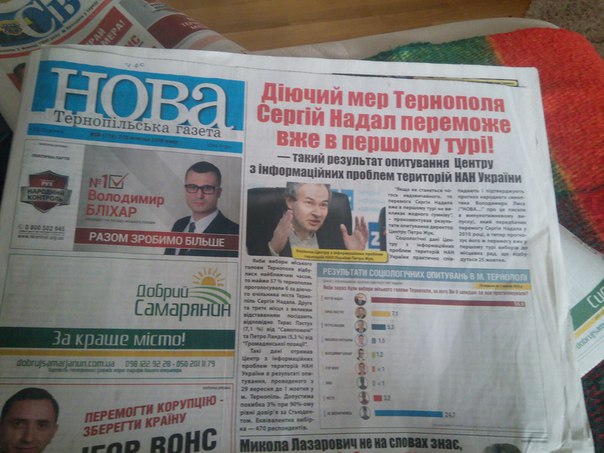 Отож, у руки потрапили наступні регіональні видання: «Нова Тернопільська газета»( №38(774) 7 -13 жовтня), «Номер Один»( №40( 512) від 7.10.2015) та «Наш день» ( № 39 ( 120) від 7- 13 жовтня 2015). Перш за все увага концентрується навколо першої сторінки. Дві газети («Нова Тернопільська газета», «Наш день») продублювали цікавий рейтинг, згідно з яким беззаперечним лідером у виборчій перегонці за посаду мера стане діючий очільник міста. Здавалося б і посилання на структуру, що займалась дослідженням є, фото керівника структури для впевненості додали. Проте на ознаки замовності чи то дослідження, чи то матеріалу вказує перш за все фантастичний відрив С. Надала та вибірка, яка для багатотисячного міста є мізерною.