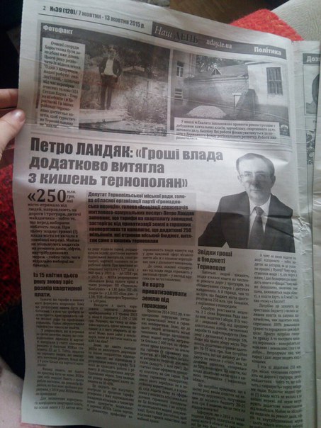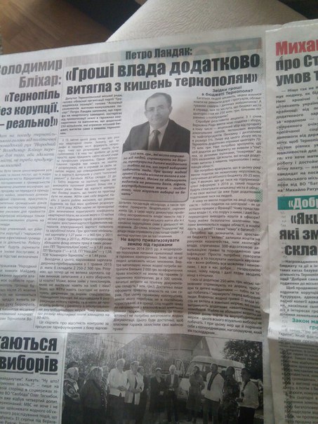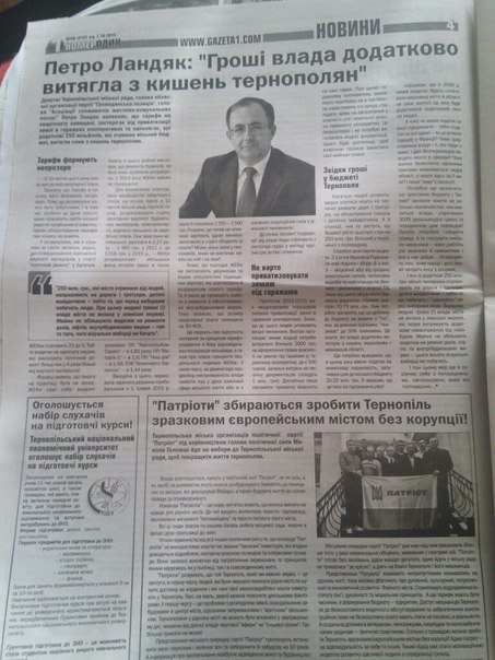 На наступні сторінці усі три видання дублюють цілу низку матеріалів. Деякі мають ідентичні заголовки і відповідно однаковий зміст. Для прикладу публікація “ Петро Ландяк: « Гроші влада додатково витягла з кишень тернополян»” є відвертою «джинсою». Таке собі відверте обливання брудом, оперуючись при цьому сумнівними цифрами та підсумками. На замовність вказує навіть заголовок. Його основна мета не інформувати, а притягнути увагу. Слова “гроші та влада” виділено візуально, а це притягує читача та створює у нього попередню негативну установку. Ця публікація не має спеціального маркування “політична реклама” і подається як надважлива новина, хоча новинності у ній немає. Лише оперування сумнівними цифрами.