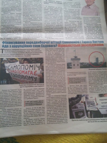У тому ж дусі обливання брудом написаний ще один матеріал, який продубльований у газетах. У ньому увесь дьоготь спрямовують на Об’єднання «Самопоміч», зокрема представників Пастуха та власне Садового. Однаковий візуальний ряд, аргументи заставляють робити висновки:чергова передвиборча “чорнуха”.