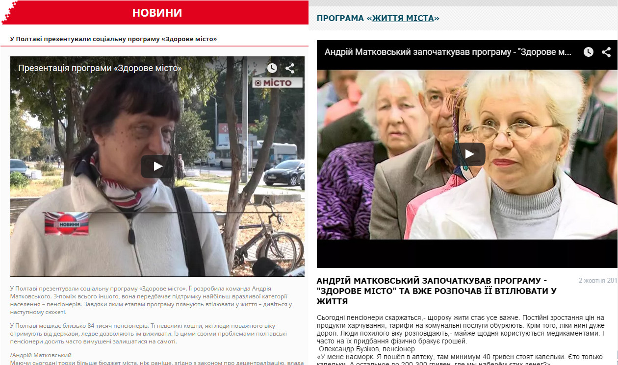 Окремо варто згадати про сюжет "У Полтаві презентували соціальну програму «Здорове місто»", в якому фактично висвітлюється підкуп виборців. «Відтак, аби у подальшому підтримати полтавців поважного віку, команда Андрія Матковського розробила соціальну програму «Здорове місто». Першим пунктом у ній є якраз адресна фінансова допомога всім без винятку полтавським пенсіонерам. Цими коштами, говорить Андрій Матковський, останні зможуть розпоряджатися на свій розсуд: купити ліки, запастися продуктами харчування, витратити на інші потреби», – зазначається в сюжеті.