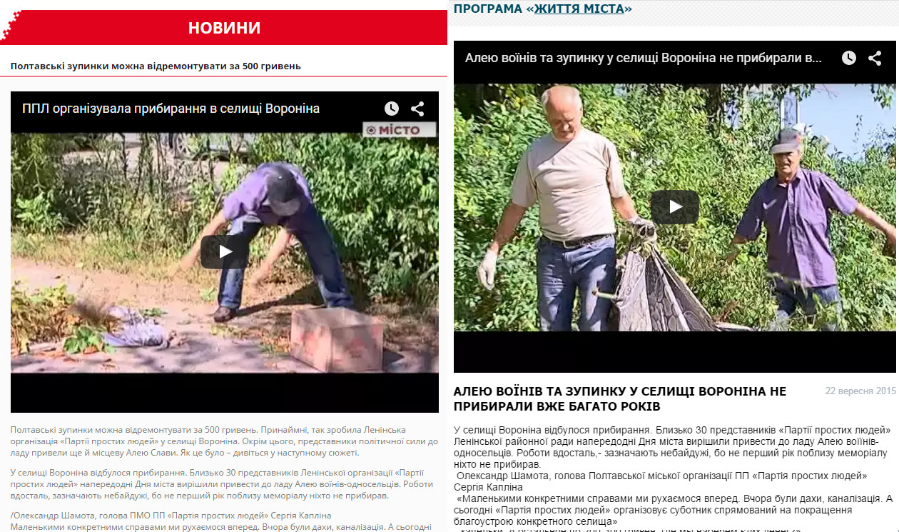 Спочатку розглянемо репертуар каналу «Місто». Кожна з партій має свою медійну стратегію. Так в сюжетах про «Партію простих людей» очолювану Сергієм Капліним акцент робиться на бездіяльності нинішньої міської влади, проблемах, що виникли внаслідок цього, та їх вирішенні за допомогою членів «ППЛ». Зокрема, в сюжеті "Полтавські зупинки можна відремонтувати за 500 гривень" йдеться про те, як представники партії провели прибирання та благоустрій територій на околиці Полтави. «Не треба витрачати мільйонів, а треба тільки зібрати однодумців для того, щоб зробити конкретну справу, яку зробила «Партія простих людей». Відремонтували зупинку, на яку витратили декілька сот гривень, а не декілька мільйонів, як це робить міський голова», – заявляє з екрану голова ПМО ПП «Партія простих людей» Олександр Шамота.