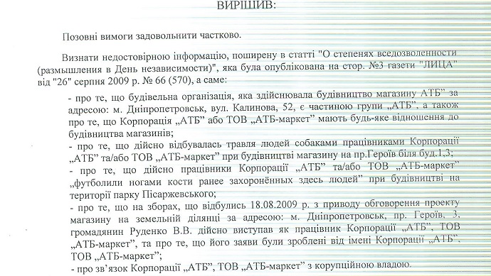 Тоді АТБ звернулися до суду з вимогою спростувати інформацію, яка на їхню думку є недостовірною. Ще у 2009 році Господарський суд Дніпропетровської області ухвалив рішення визнати недостовірною та зобов'язати «Лица» спростувати таку інформацію: