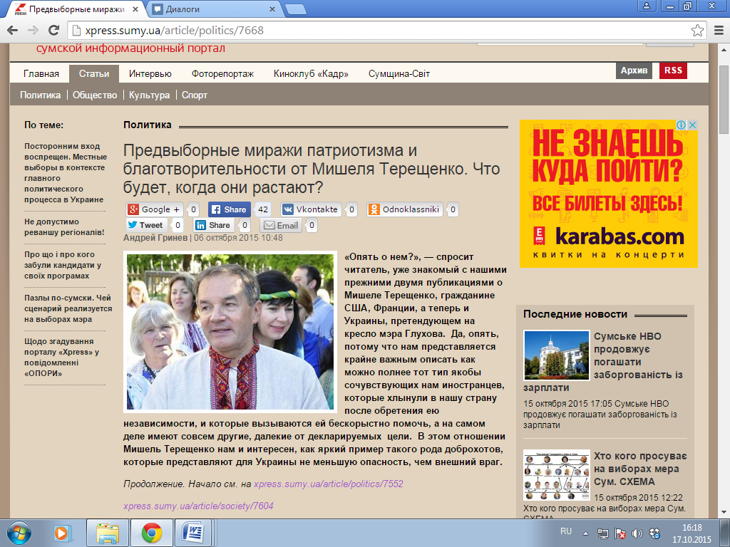 Журналіст переконаний, що виконує ледь не стратегічно важливу місію. Третій матеріал серії – «Предвыборные миражи патриотизма и благотворительности от Мишеля Терещенко. Что будет, когда они растают?» – розпочинається так: «Опять о нем?», — спросит читатель, уже знакомый с нашими прежними двумя публикациями о Мишеле Терещенко, гражданине США, Франции, а теперь и Украины, претендующем на кресло мэра Глухова. Да, опять, потому что нам представляется крайне важным описать как можно полнее тот тип якобы сочувствующих нам иностранцев, которые хлынули в нашу страну после обретения ею независимости, и которые вызываются ей бескорыстно помочь, а на самом деле имеют совсем другие, далекие от декларируемых цели. В этом отношении Мишель Терещенко нам и интересен, как яркий пример такого рода доброхотов, которые представляют для Украины не меньшую опасность, чем внешний враг». Автор натякає, що закінчення серії – не за горами. У кінці матеріалу стоїть примітка – «Окончание следует».