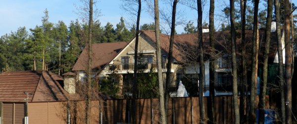 Маєток Захарченка ще будується. За парканом, що простягнувся майже на 300 метрів проглядається кілька будівель різного ступеню готовності. Нині тривають будівельні роботи, працює кран.