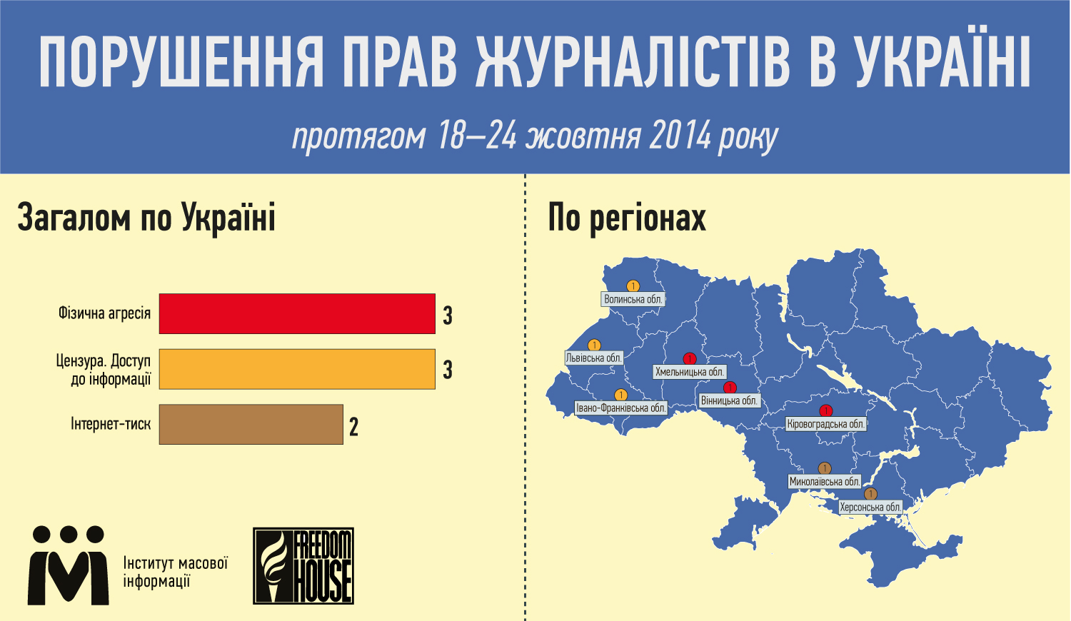 У період із 18 по 24 жовтня в Україні зафіксовано по 3 випадки порушень прав журналістів в категоріях «Фізична агресія» та «Цензура. Доступ до інформації» і 2 випадки інтернет-тиску.