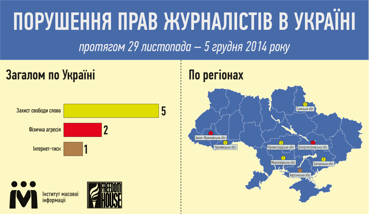 У період із 29 листопада по 5 грудня зафіксовано 2 випадки порушень свободи слова в категорії «Фізична агресія», один випадок інтернет-тиску та 5 випадків в категорії «Захист свободи слова».