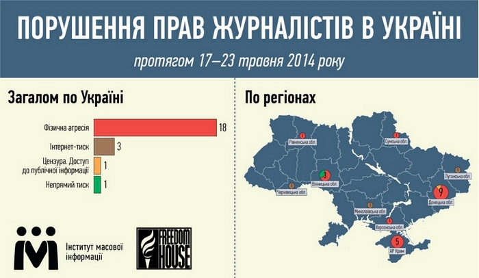 Терористи двічі обстріляли телевежу поблизу Слов'янська (Донецька обл.), де розташована ретрансляційна станція. Під час зйомок сюжету був обстріляний вертоліт із журналістами ТРК "Донбасс". Озброєні представники самопроголошеної Донецької народної республіки захопили машину з частиною тиражу інформаційного бюлетеня Незалежної профспілки гірників Донбасу «По-Горняцки». В Артемівську прихильники Донецької народної республіки захопили міськраду та перешкоджали журналістам. До редакції "Громадського телебачення Донеччини" надійшли погрози фізичної розправи від невідомого. Двоє маріупольських журналістів заявляють про погрози і мають намір залишити місто через небезпеку.
