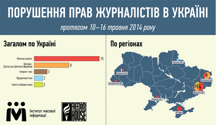 Почастішали випадки обстрілів. Знімальна група «5 каналу» потрапила під обстріл під час нападу озброєних терористів на блокпост Національної гвардії на в'їзді до Маріуполя (Донецька обл.). Сепаратисти у Слов'янську вночі обстріляли з мінометів телевежу. Було здійснено блокування озброєними сепаратистами приміщення телевежі у Краматорську та озброєні напади на «Радіо Ера ФМ», де працівників донецького телецентру Концерну РРТ змусили вимкнути передавач. Через погрози сепаратистів підпалити редакцію газети та сайту «Привет/Новости Краматорска» випуск видання зупинено. Кореспондента російської опозиційної газети «Новой Газеты» Павла Канигіна викрали в Артемівську Донецької області. Журналістам, які працюють на Донбасі та відмовляються підкорятися керівництву самопроголошеної Донецької народної республіки, бойовики погрожують розправою.