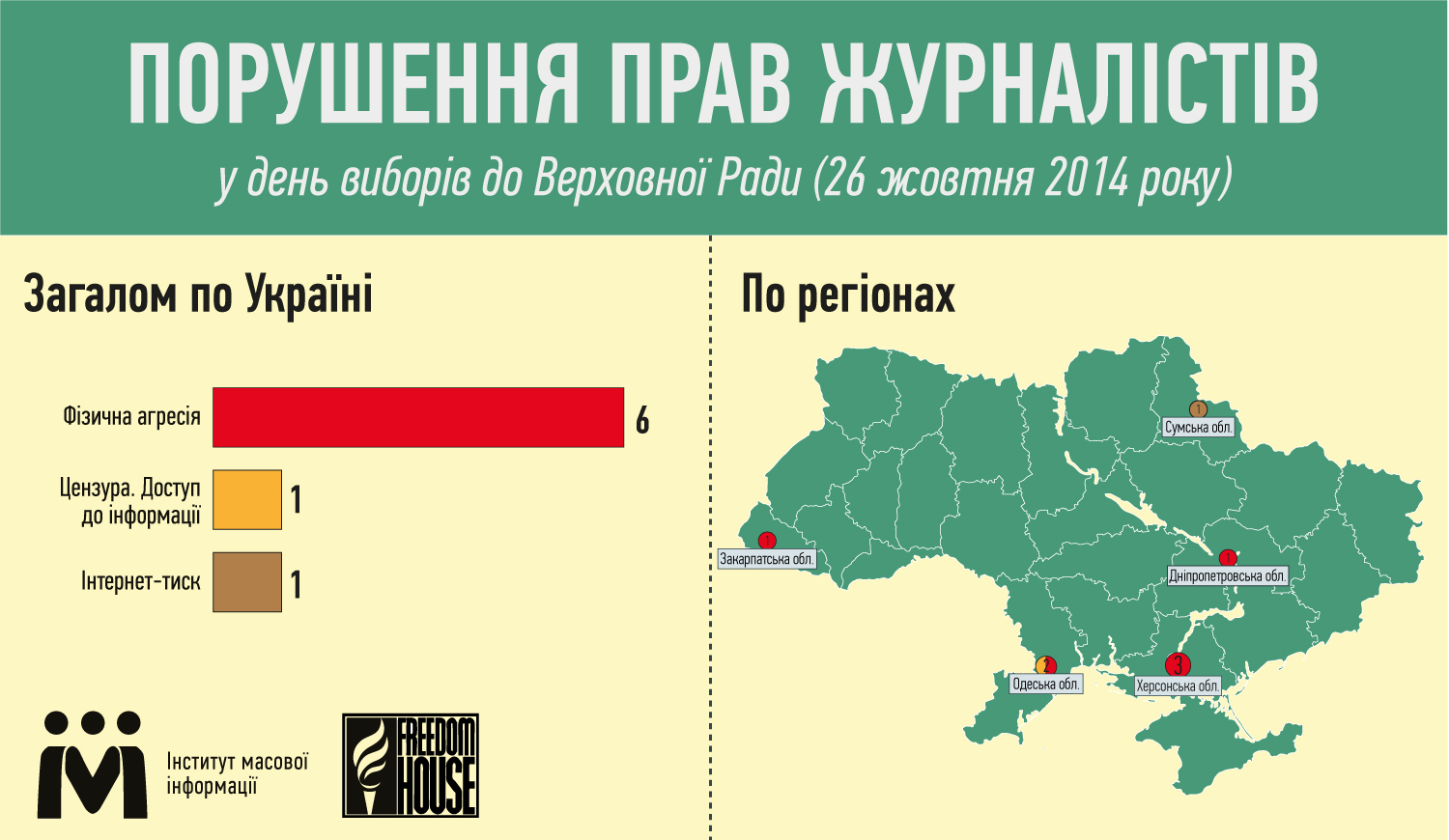 26 жовтня в Україні зафіксовано 8 випадків порушень прав журналістів. У категоріях «Фізична агресія» – 6 випадків і по одному випадку в категоріях «Цензура. Доступ до інформації» «Інтернет-тиск».
