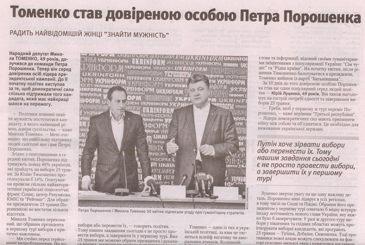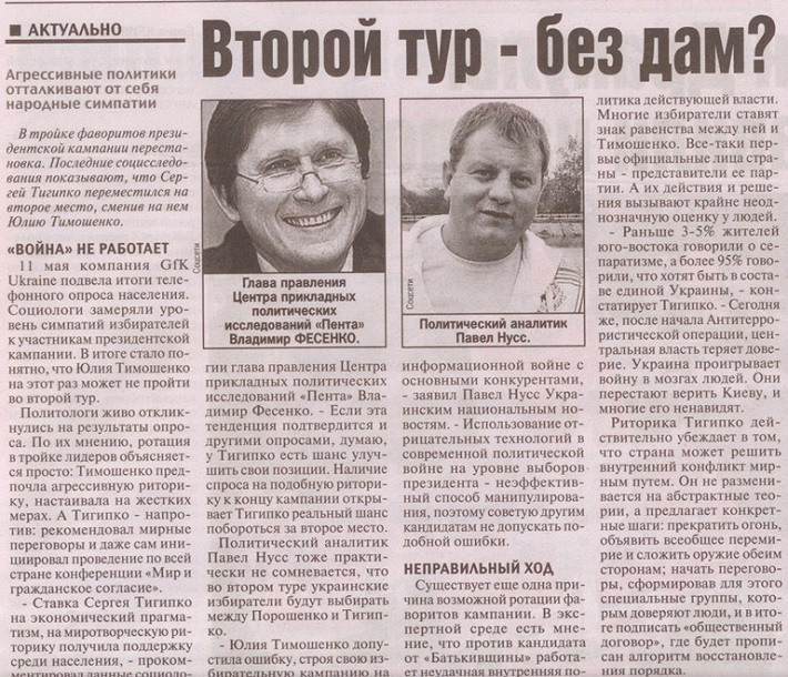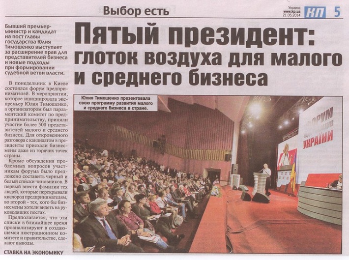 При цьому «сильний лідер» країни за публікаціями в ЗМІ це не лише Сергій Тигіпко, як би йому хотілося, але й також Юлія Тимошенко, знеособлені біг-борди із її символікою про «сильного лідера» для країни висять і після виборів. Зауважмо, Тимошенко позиціонує себе «лідером» – це вам навіть не «лідерка», бо ж це вона «єдиний чоловік в українській політиці». І це не лише завищена самооцінка самої ЮВТ, – польський публіцист Вєслав Романовський у своїй книжці з 2007 року «Україна. Зупинка свобода» пригадує власну розмову із Леонідом Кучмою під час першого ув’язнення Тимошенко, і тодішній президент, запитаний про те, чому така гарна жінка мусить сидіти у в’язниці, відрізав: «Вона вже давно перестала бути жінкою». Чого в цих словах більше – сексизму чи поваги до сильної особистості, судити вам. Натомість, у теперішній кампанії лише Тимошенко дозволила собі передати куті меду і в передвиборчих промо-матеріалах величати себе «п’ятим президентом України»: «Пятый президент: глоток воздуха для малого и среднего бизнеса»(«КП в Украине», 21 травня).